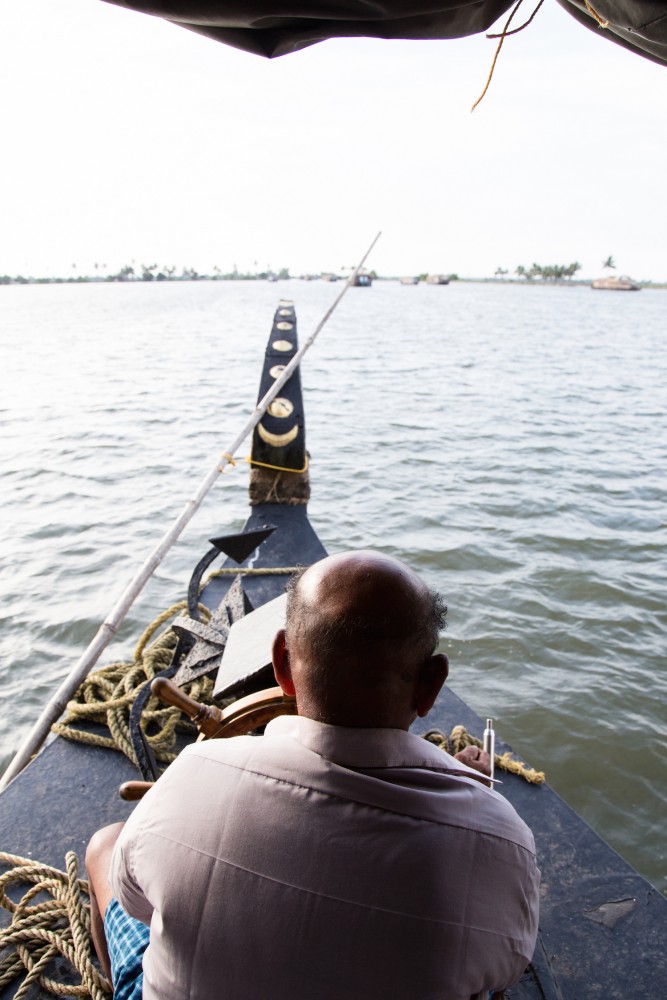 Wir gingen pünktlich zur stechenden Mittagshitze auf das Hausboot und wurden von Sam begrüßt. Sam, ein großer, kräftiger Mann, der so untypisch indisch aussah und mich irgendwie an Denzel Washington erinnerte. Er redete ruhig, bedacht, war unaufdringlich und doch präsent. Ich hatte von Anfang an das Gefühl, er wäre anders, als die typischen Inder, die man so kennenlernt. Meist sind es doch schüchterne, manchmal nervöse, oftmals neugierige Menschen. Sam nicht, zumindest zeigte er es nicht. Er erklärte uns das Hausboot und servierte uns ein sehr leckeres, typisch keralisches Mittagessen auf einem Bananenblatt.