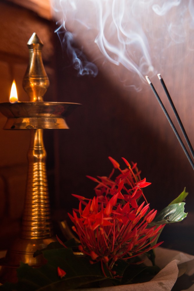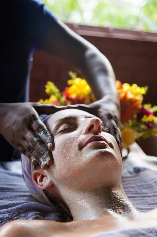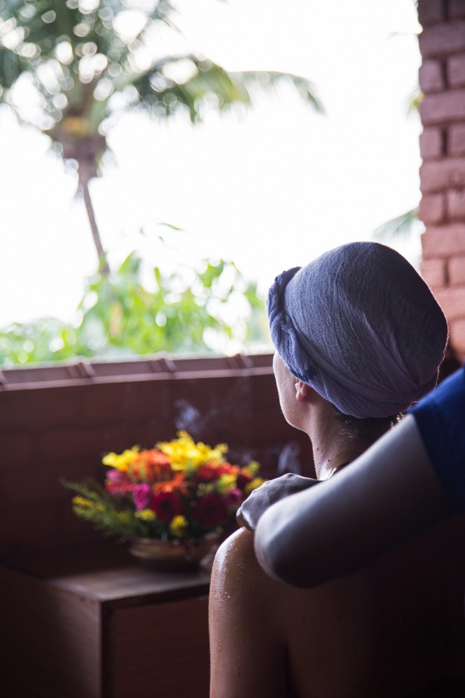 Danach folgte meist eine Fußmassage – nein, nicht die Füße wurden massiert, sondern mit den Füßen wurde massiert. Daraufhin schlief ich bei der vierhändigen Ganzkörpermassage (Abyhangam) fast immer ein und wurde kichernd geweckt zur Spezialanwendung, beispielsweise der Gesichtsbehandlung, Shirodhara (Stirnguss, bei dem langsam sehr hochwertige Öle auf die Stirn gegossen werden und durch die Haare nach hinten ablaufen), Anwendung mit Schlamm, bestehend aus einer Kräuterreispaste – hach.