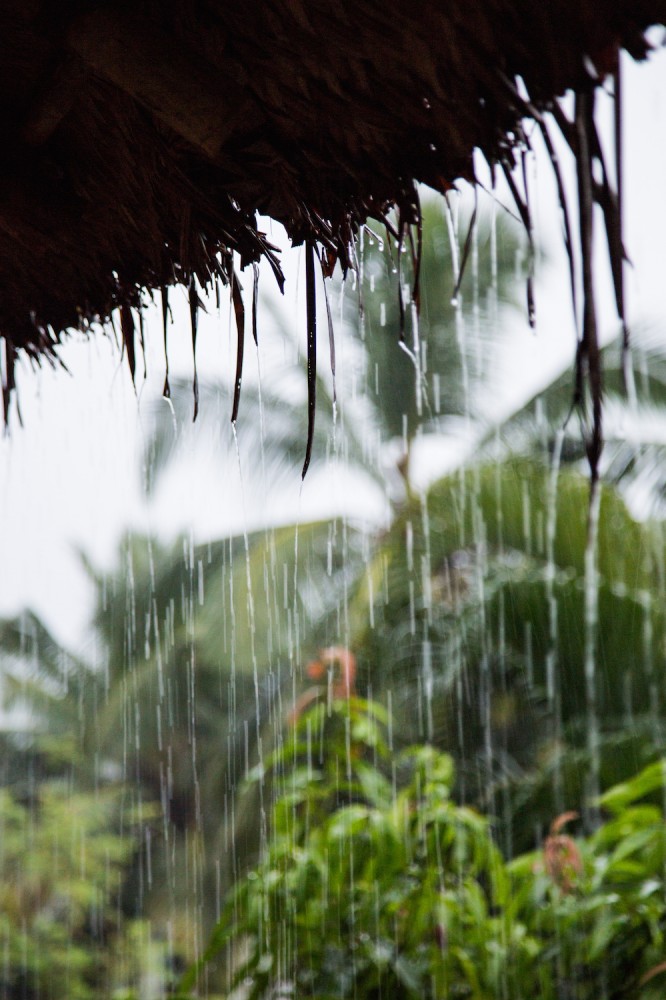Dann treten wir nach draußen. Es ist der vierte Regentag innerhalb einer Woche und ich war mürrisch aufgewacht. Doch was sich zu meinen Füßen ausbreitet, ist der Blick auf den Dschungel, das Meer und der Horizont. Regen tropft von den Palmen, Blüten glänzen. Eine Weile lausche ich den Geräuschen der Natur. Dem Meer, das so aufgewühlt ist, dass ich es ehrfürchtig betrachte, anstatt mich hineinstürzen zu wollen.