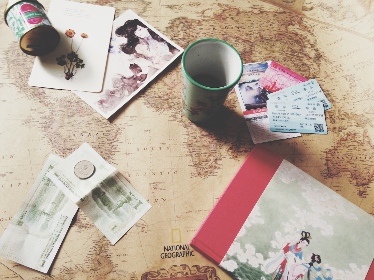 Zum Espressoshot am frühen Nachmittag gehört natürlich das Shoppen. Und obwohl ich Letzteres auf Reisen grundsätzlich nicht groß schreibe und meist auf den allerletzten Tag hinausschiebe, bin ich in Peking nicht daran vorbeigekommen. Die Hutongs quillen über mit einem Designerladen nach dem anderen, teilweise komplett verrückt und ohne massentauglichem Konzept, aber auch irre schön, günstig, voller Details und guter Spürnase für neue und absurde Trends. Ich habe neben einer kuscheligen Wolljacke, die ich derzeit zu fast jedem Outftit kombiniere, Postkarten mit altchinesischen Drucken, Notizbücher, Tassen, Tee und eine vergilbte National Geographic Weltkarte gekauft (siehe Bild unten).