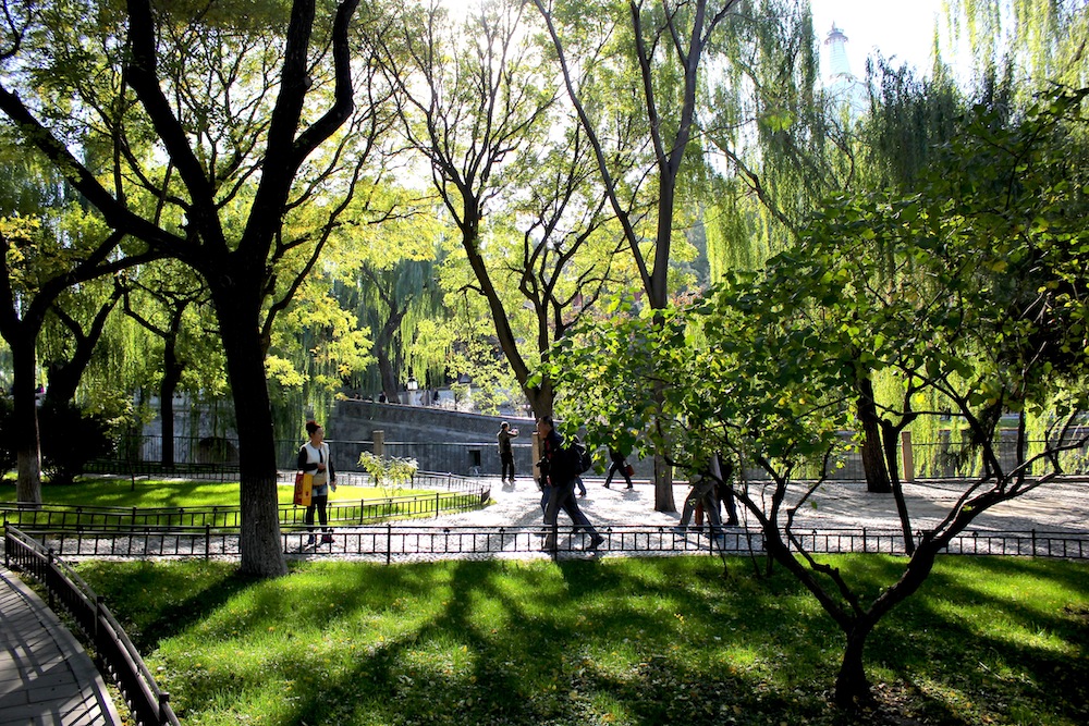 Grün, grün, grün… ist Peking. Vorausgesetzt, der Smog lichtet sich und man kann was sehen. Dann glitzert die Sonne auf den Wasseroberflächen und das Grün der Parks schüttelt seinen Grauschleier ab. Überall gibt es Enten, Boote, Künstler und Fischer zu beobachten, Familien machen Picknicks und Pärchen rücken auf den Bänken näher zusammen. Schade nur, dass manche der Parks (geringen) Eintritt kosten, was mein Verständnis zur Natur und dem Sinn des Allgemeinwohls übersteigt.